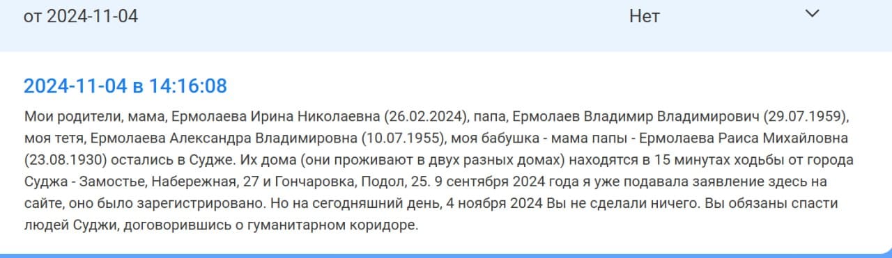 По подсчетам родственников в Суджанском районе под контролем ВСУ находятся от 2 до 3 тысяч человек. Среди них родители Елены Ермолаевой, а так ее бабушка и тебя. О том, что они живы женщина узнала из видео Теробороны ЗСУ, которые регулярно выкладывают на Ютюб.